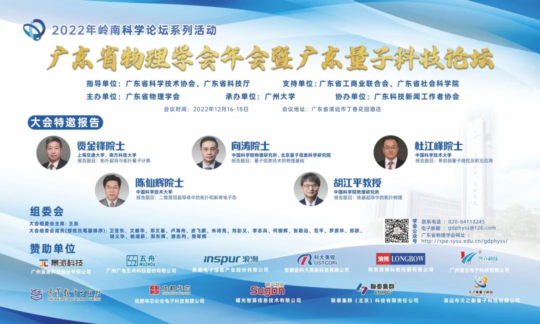 12月18日下午,2022年度广东省物理学会年会暨广东量子科技论坛圆满结束。由广东省科协、省科技厅指导,广东省物理学会主办的《2022年岭南科学论坛系列活动——广东省物理学会年会暨广东量子科技论坛》于12月16-18日在广东省清远市丁香花园酒店举行。2022 年岭南科学论坛系列活动-广东省物理学会年会暨广东量子科技论坛是广东省物理学工作者和相关企事业代表进行专题讨论及交流的会议。与会代表将报告他们近年来的研究成果,交流科研和教学的经验,以及对物理学及其应用的重要方向和发展前景进行评述。大会将邀请多名院士做主题演讲。